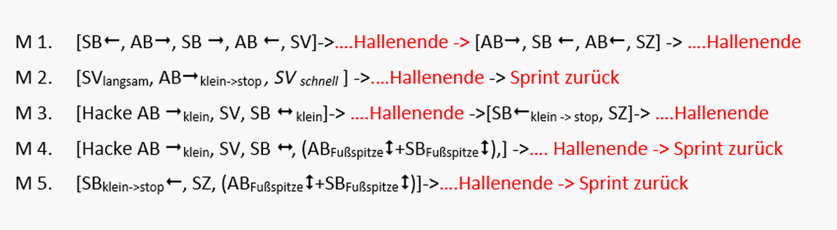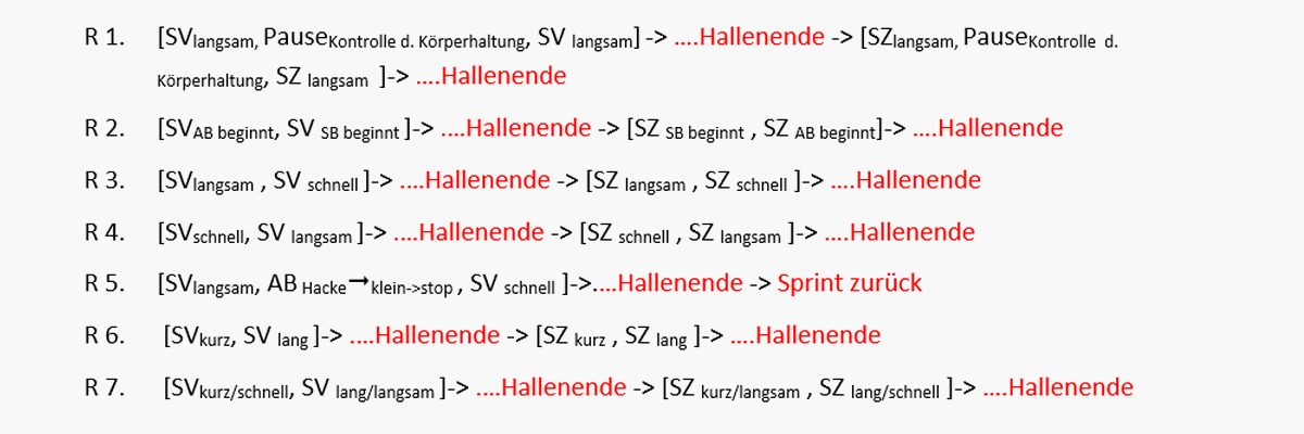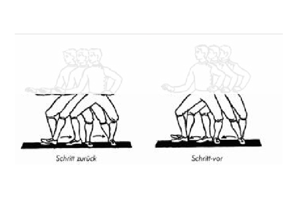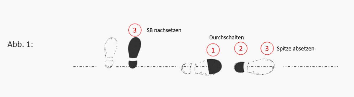 Ü 3. Bewegungsablauf SV: Druck aus dem SB aufbauen, Körper minimal nach vorne schieben um das Gewicht auf die Fußspitze des AB zu verlagern, Ferse des AB entlasten bzw. unmerklich anheben um die Gewichtsverlagerung zu unterstützen – Fußspitze verbleibt zunächst am Boden. Jetzt Fußspitze des ABanziehen (Durchschalten). Durch die Vorspannung schießt die Ferse des AB knapp über dem Boden nach vorne und setzt nach ca. einer Fußlänge wieder auf den Boden auf. Die Fußspitze des AB senkt sich auf den Boden ab, gleichzeitig wird das SB um den gleichen Abstand zum SV nachgesetzt. (s. Abb 1)